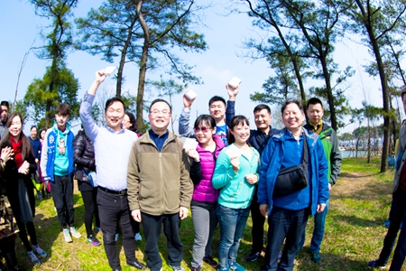 上午九点半,活动正式开始。湖北省侨联舒副主席进行了授旗仪式,一声发令过后,近70人的队伍浩浩荡荡向落雁岛迈进,开始徒步。大家从东湖磨山南门出发,一路经过楚城、哲思园、林间木屋、郊天坛,最后抵达活动终点落霞归雁,全程约6公里。漫步其中,湖光山色相连,秀美山水引人入胜,大家纷纷拿出手机记录下徒步过程中的美好春色、动人瞬间与有趣画面。神秘的寻宝环节给活动增加了无限趣味和惊喜,也极大调动了大家的积极性。省侨联副主席舒正荣和新侨会会长陈义红亲自为获胜小组颁发纪念品。